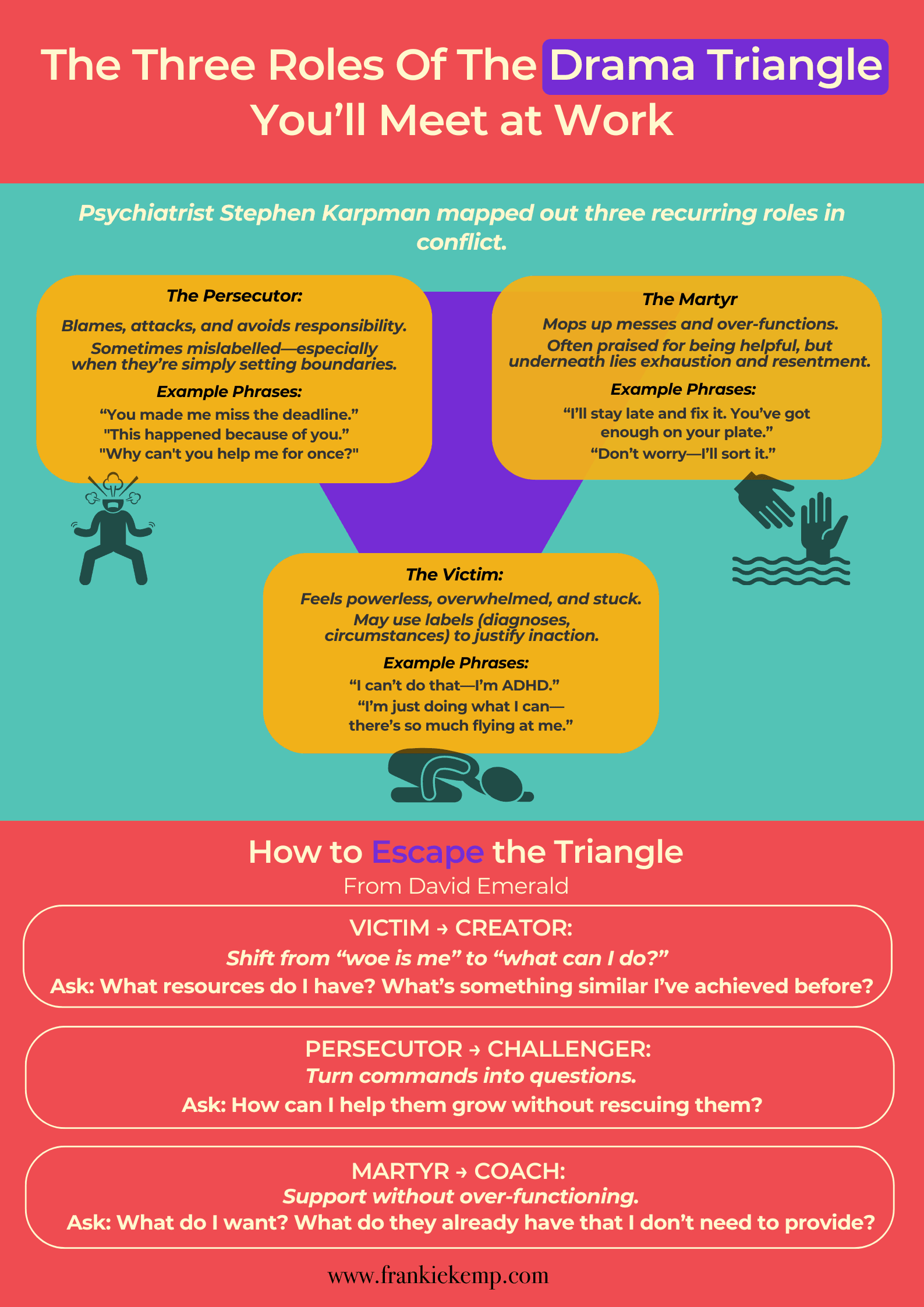 Referring back to that escape room which I mentioned above, we’ll now turn the lights on so you can see the behavioural clues. Psychiatrist Stephen Karpman, who also trained as an actor, mapped out three recurring roles in conflict: