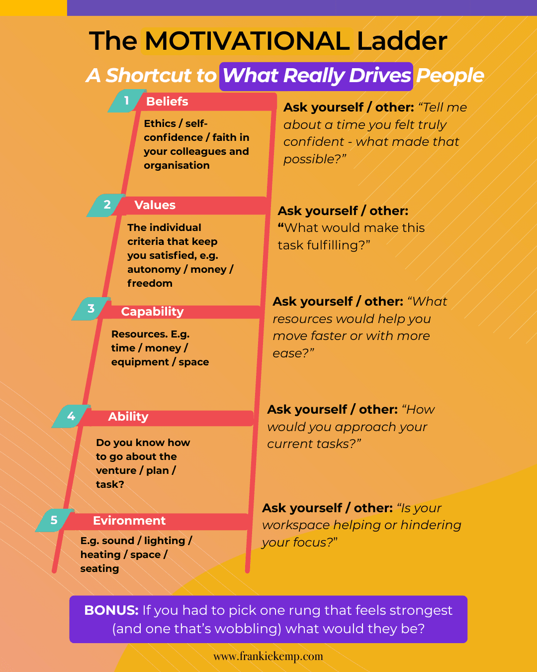 Save time with targeted questions: the questions that pertain to each rung help spot what’s wobbling and what’s working in terms of resources, support, satisfaction using these emotionally intelligent prompts.Use them to diagnose motivation – your own or your teams’ – and guide with acuity, as opposed to clumsy guesswork.