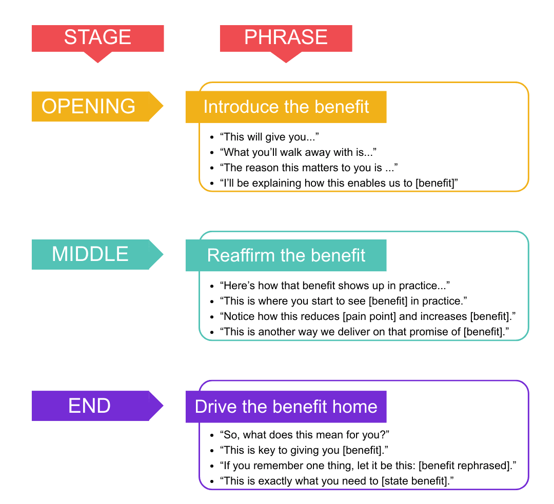 You don’t have to state the benefit in exactly the same way each time. For example if your WIIFM is ‘Strategic Clarity’, you’d be well-advised to rephrase this. Ironically, this phrase is quite foggy. To make it more concrete, you can echo this in several ways: