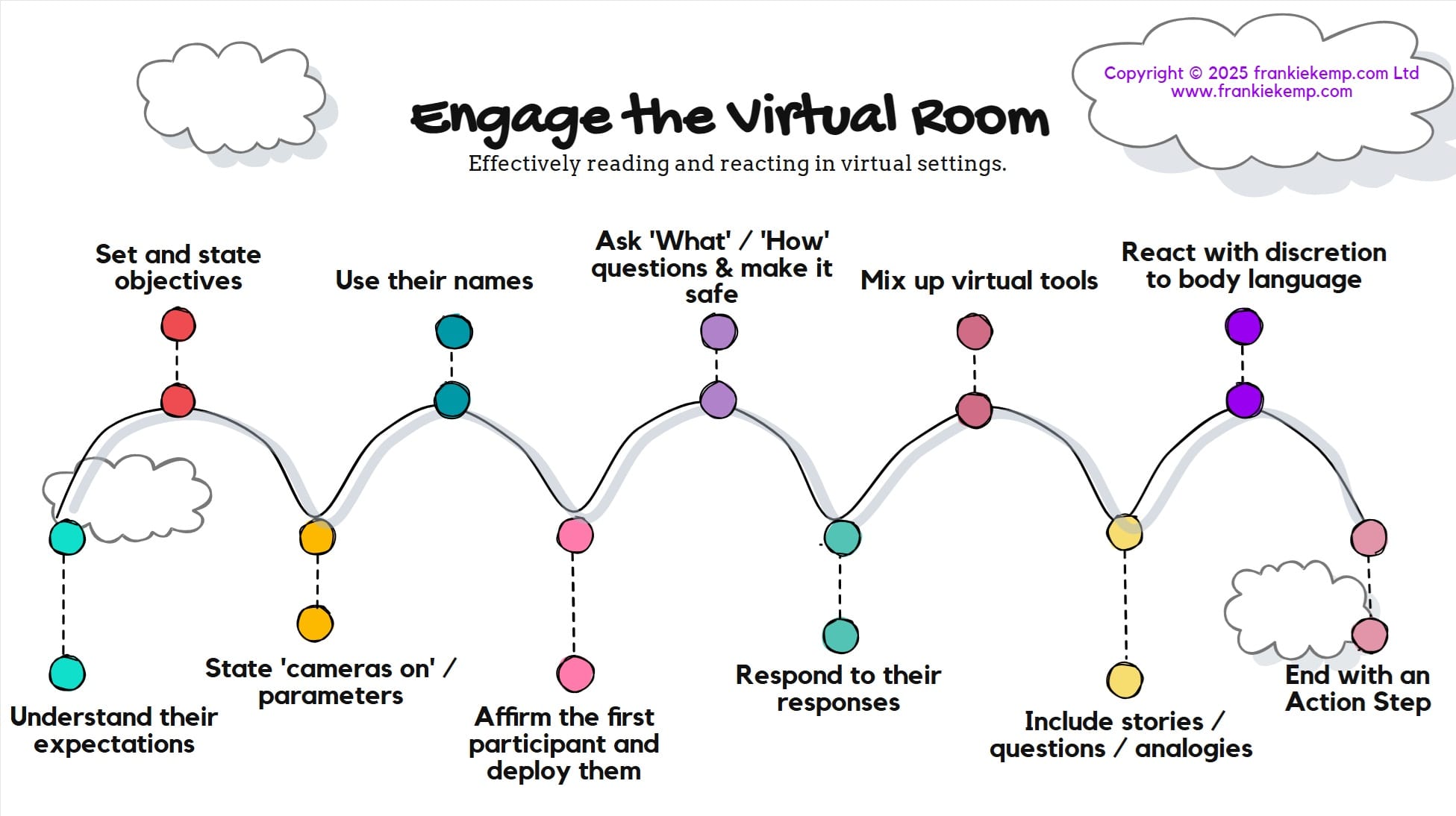Communication skills training often starts here: make people feel seen. Even in a digital space, little actions make all the difference between engagement and disconnection. Use names, ask questions, mix up how you involve people and adapt to what you see.